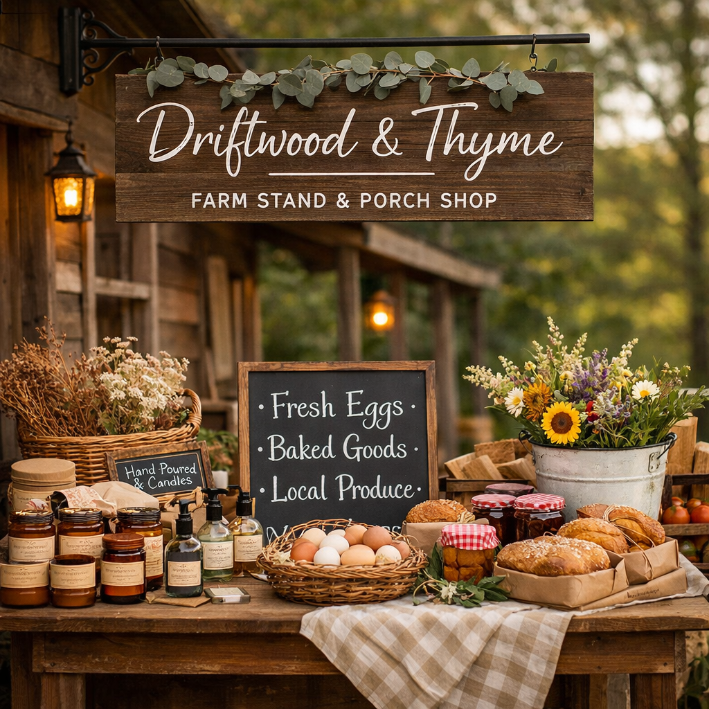 Welcome to Driftwood & Thyme's farm stand and porch shop. Here, you'll find a curated collection of handmade goods and fresh homestead favorites, each crafted with love and a commitment to cozy living.